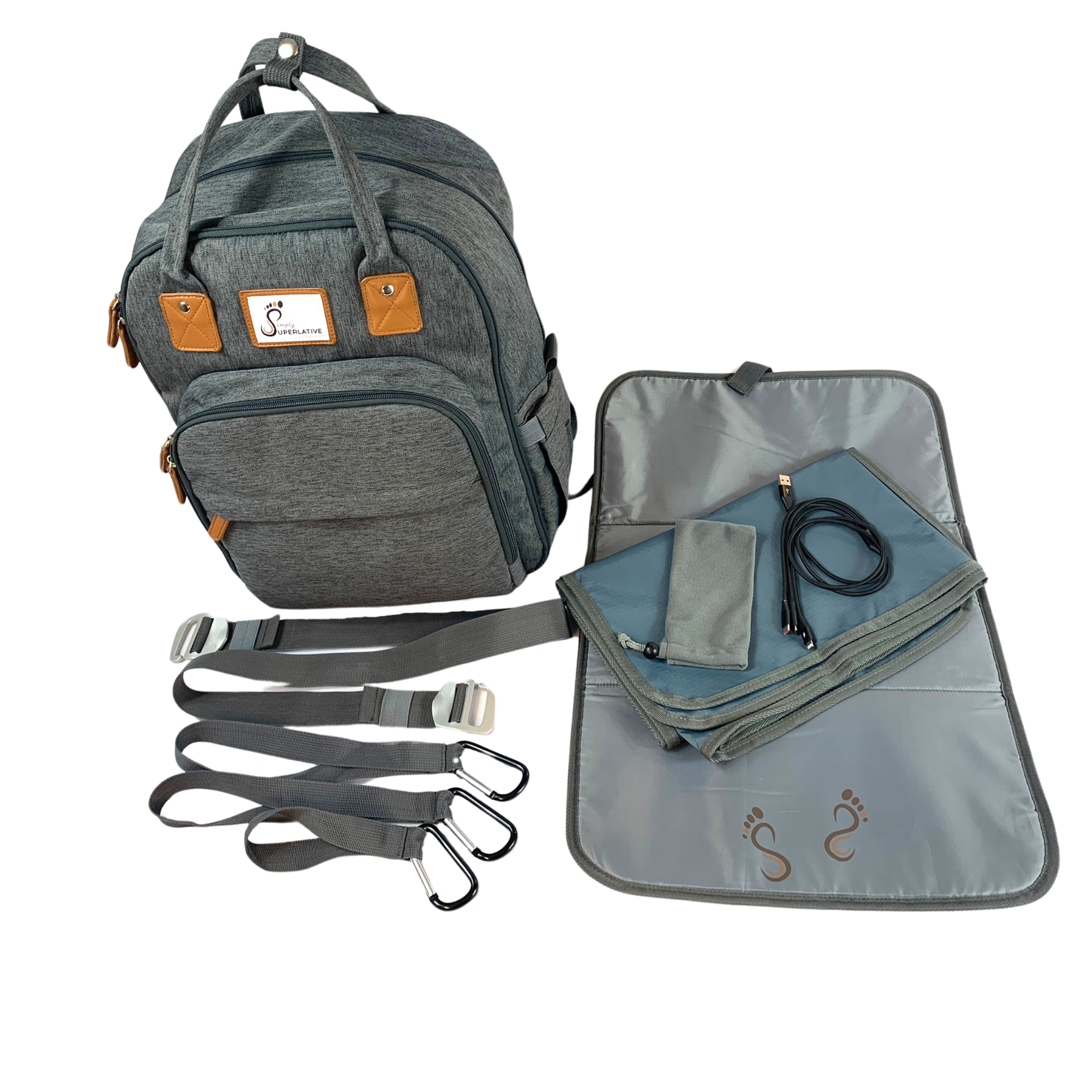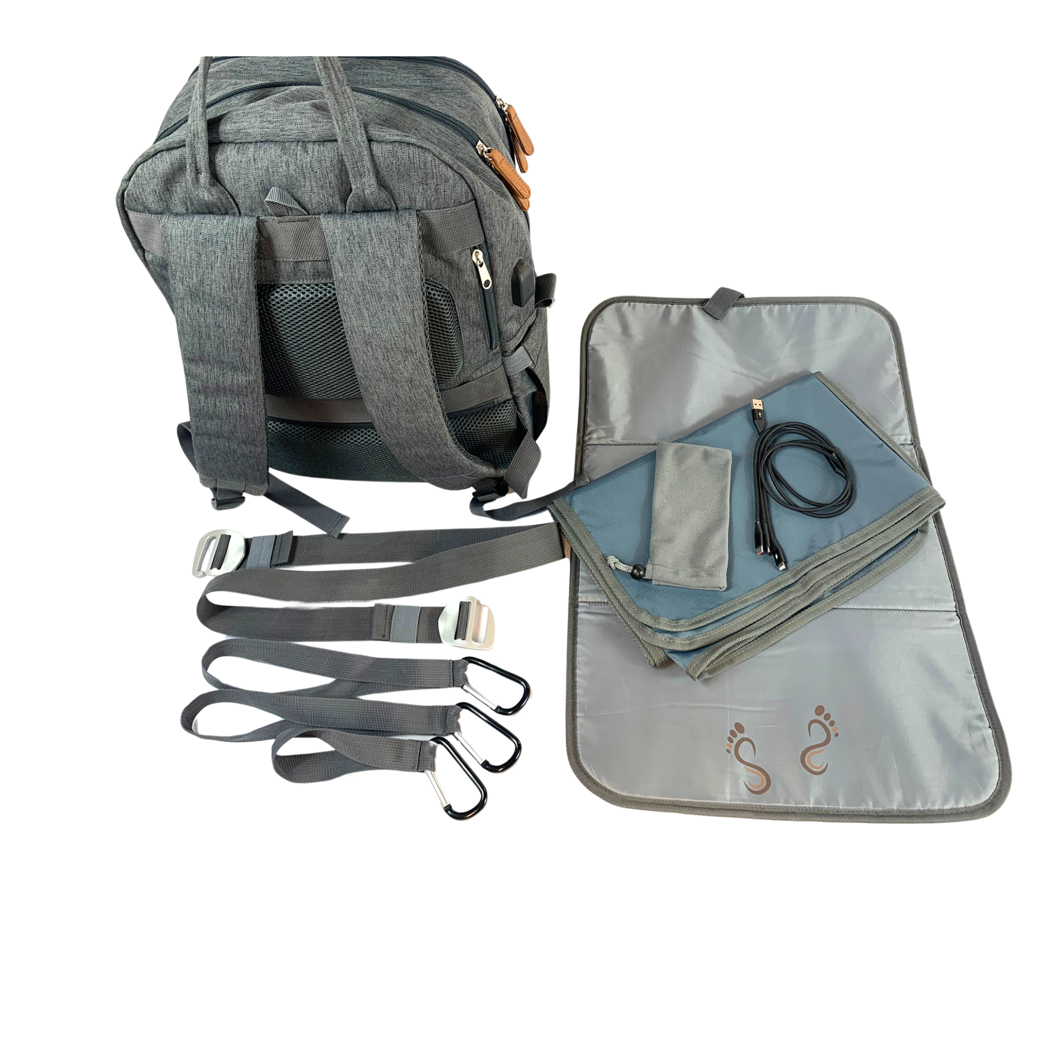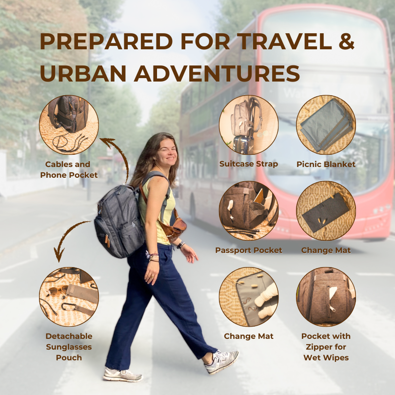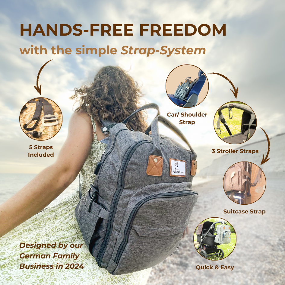 Straps for stroller, suitcase trolley, shoulder, and car seat keep your hands free and contents accessible.