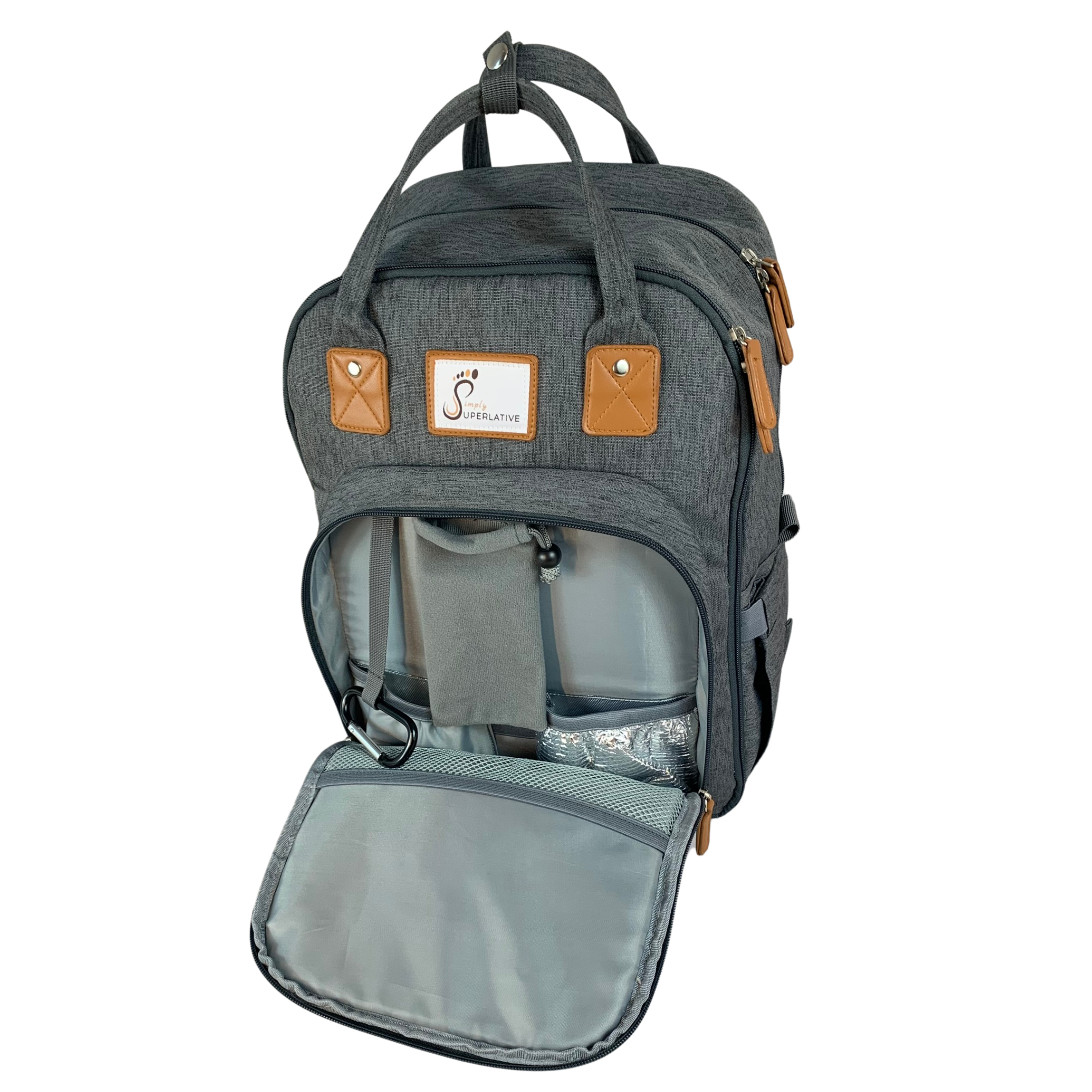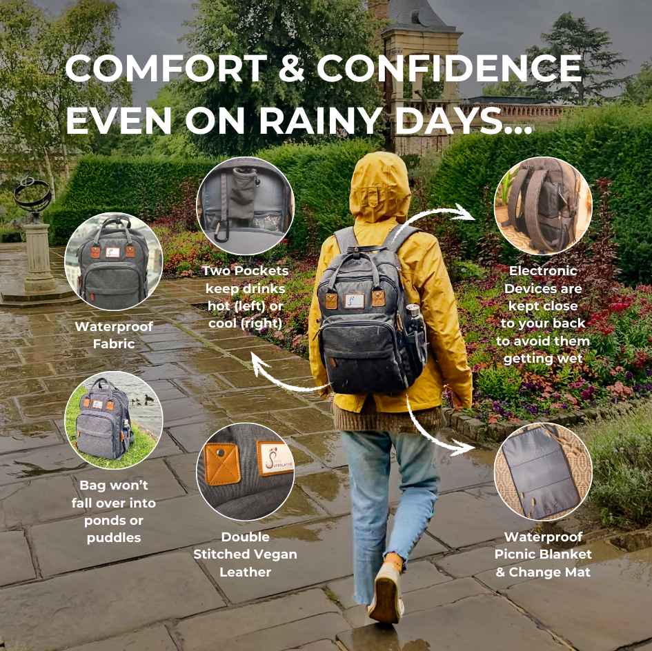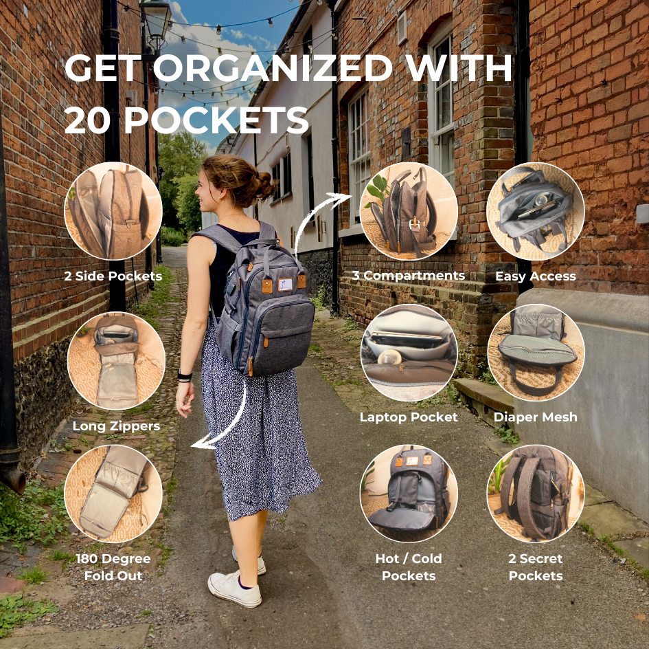 Straps for stroller, suitcase trolley, shoulder, and car seat keep your hands free and contents accessible.